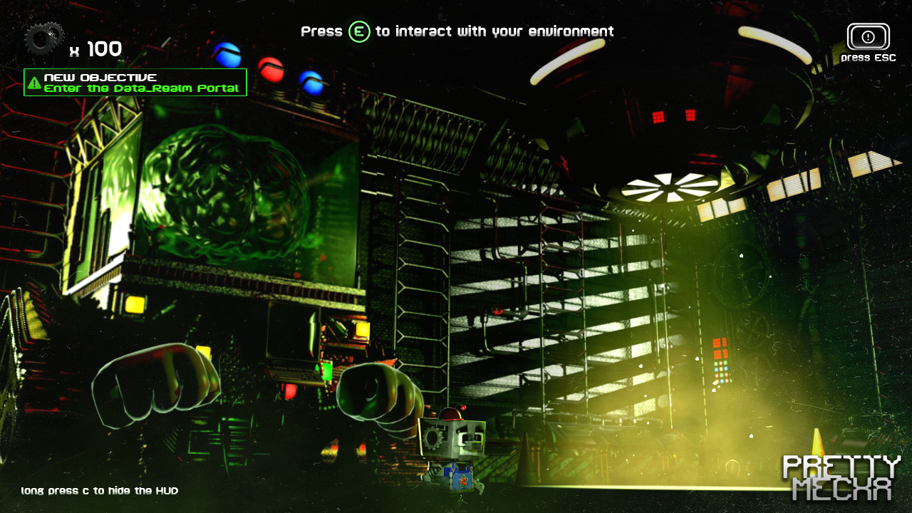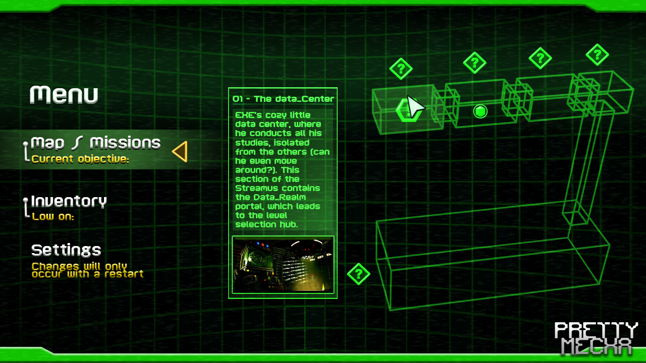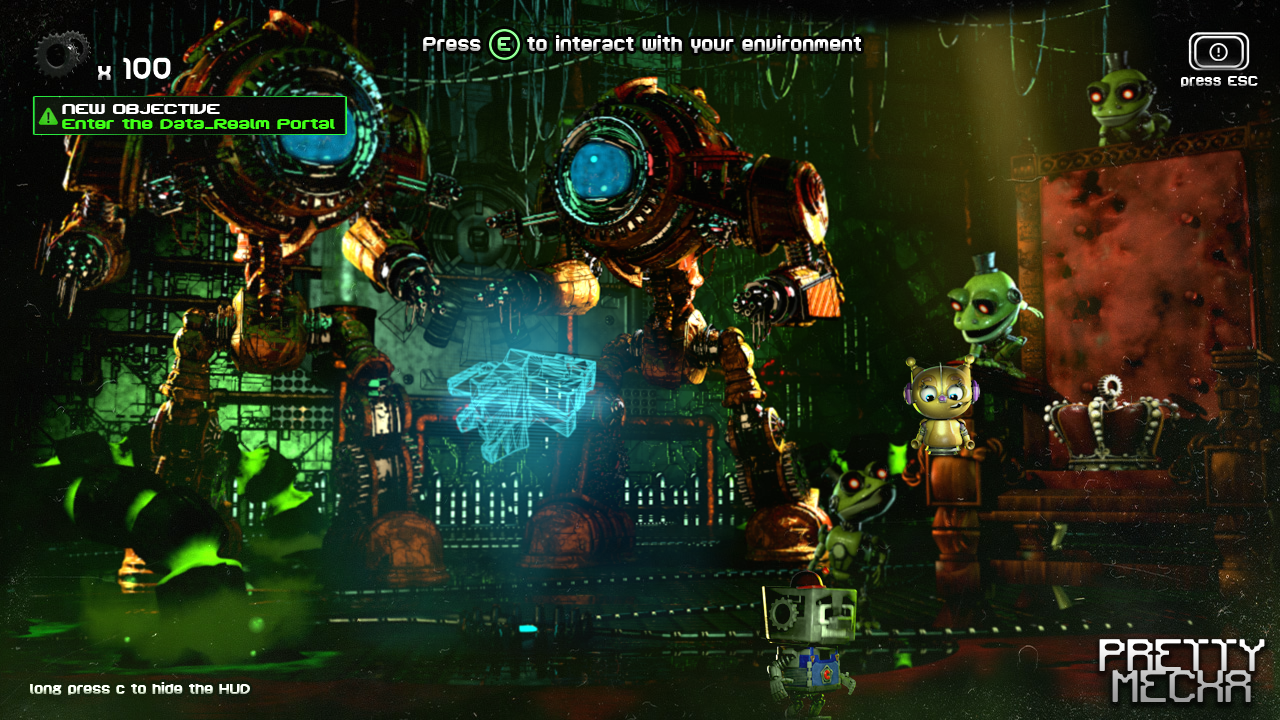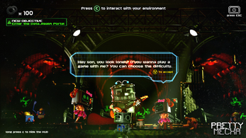 Pretty Mecha is an RPG / platformer game set in space aboard the ever-venturing ship, the Streamus. Populated by numerous friendly allies, a rebel team is already in place, and Corp has no choice but to join them to save Earth from further destruction by the Shultz Army. This terraforming species of Mega-Bots strips nearby planets of their resources to fuel their own ships. Led by Nexus, the galaxy's smartest AI, he will go to any lengths to achieve his goals. You play as Corp, who, like many others, has lost everything. Yet, what he desires most is to find his long-lost love, Mecha. Mecha possesses Lunara, a rare gemstone that holds the key to everlasting power. She is held captive by Antenna, Nexus's right-hand servant, and you must rescue her.